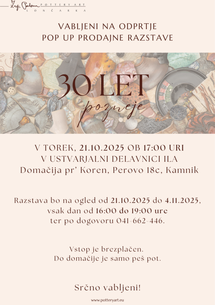 30 let pozneje je dogodek, ki v letu 2025 obeležuje 30 let mojega poklicnega delovanja. V letu 1995 sem se namreč odločila, da bo lončarjenje moj samostojen poklic. Seveda sem se takrat s keramiko ukvarjala že skoraj deset let. Na podlagi teh izkušenj je bila samostojna pot kar logična izbira. Doma v Mengšu sem si že nekaj let prej uredila prijetno delavnico, kupila sem si še peč za žganje gline. Tako je bilo vse pripravljeno. Največji izziv je bil takrat, prav tako kot je tudi danes seveda pridobitev naročil in prodaja izdelkov. Na začetku sem se kar precej udeleževala raznih sejmov, kjer sem na stojnicah prodajala svoje izdelke. Naročila sem pridobivala večinoma kar s sistemom “od ust do ust”. Moji izdelki so bili takrat predvsem tradicionalne posode. Uporabljala sem klasično rdečo glino, preprosto glazirano s transparentno glazuro. V tistem času namreč trg z materialom pri nas še ni bil razvit. Po boljše stvari bi bilo treba v tujino. No, nekaj časa je posel na ta način kar lepo cvetel.