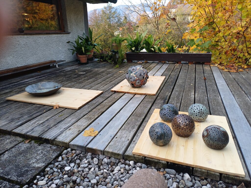 The conversation with artist Polona Zajc was an event that accompanied the closing of the exhibition 30 Years Later. The weather was beautiful, as it had been every day before. The autumn colors further enlivened the atmosphere in which the ceramic pieces had been on display for two weeks. An interview with Polona by Taja Legat Lokar was planned, but everything unfolded quite spontaneously. Quite a few visitors came, each chatting with the artist individually and thus gaining insight into her work. Along the way, we again enjoyed some pastries and warmed ourselves with tea and mulled wine. The main protagonists, Tatjana, Taja, and Polona, ensured a proper conclusion with their conversation late into the night.