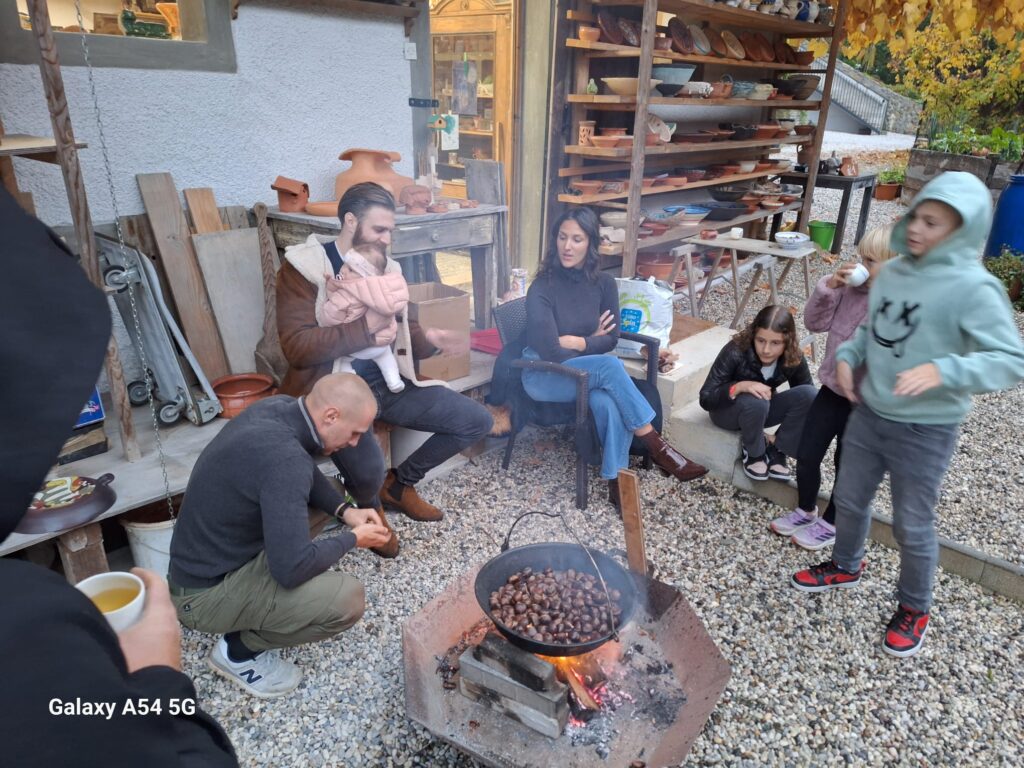 The workshop "Creating on the potter's wheel with Polona Zajc" was an event that took place alongside an exhibition of her ceramic works. We met on Tuesday, October 28, at the Ila creative workshop in Perovo near Kamnik. Both children and adults took part in the workshop. Polona invited everyone to spin clay on a potter's wheel with her help and create their own product. Spinning clay was a very special experience for everyone. Meanwhile, Tatjana led a workshop on shaping clay in other ways. So we were all busy and created a multitude of interesting products. All of them will be fired in a kiln, and some will also be colored with different glazes.
