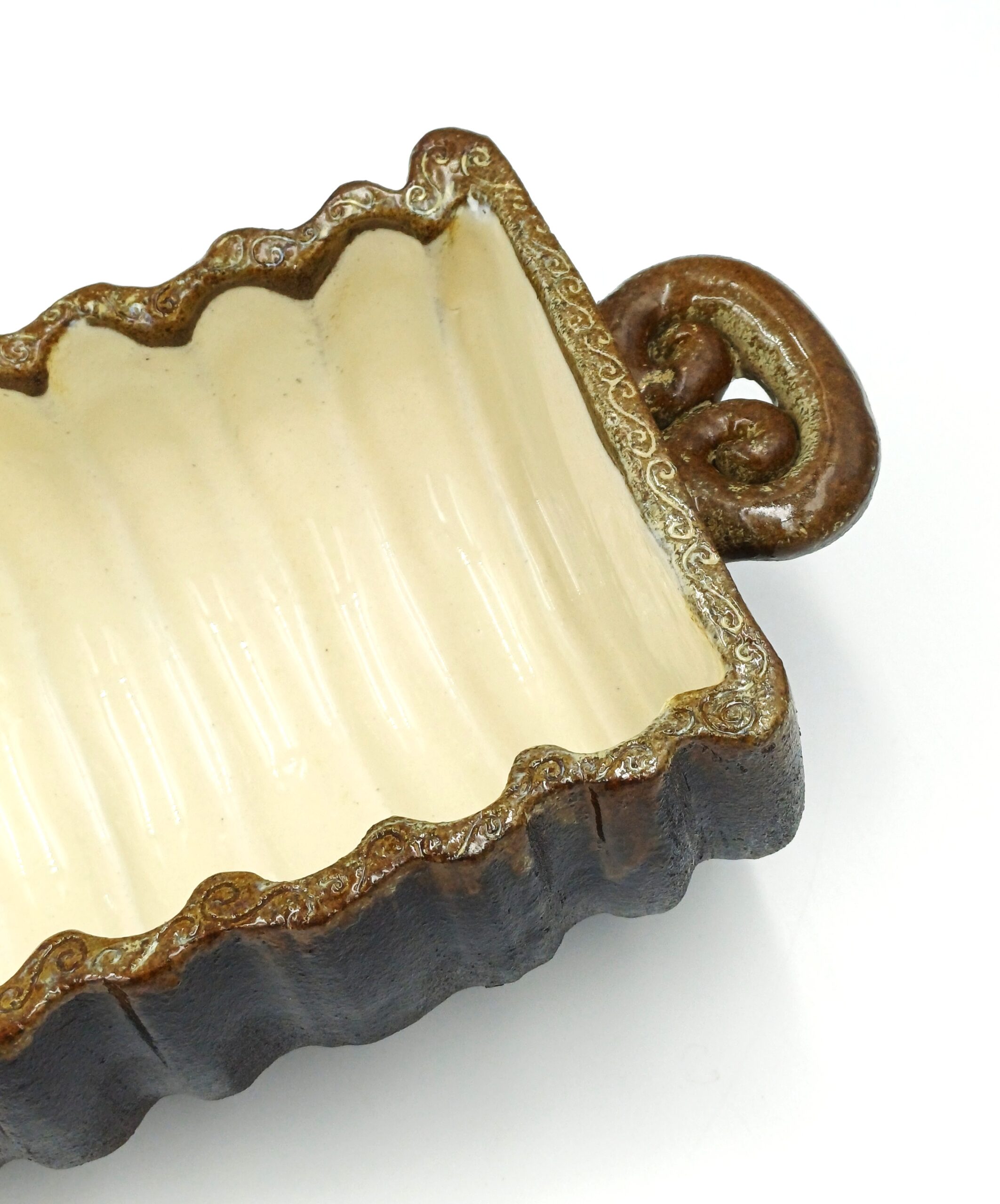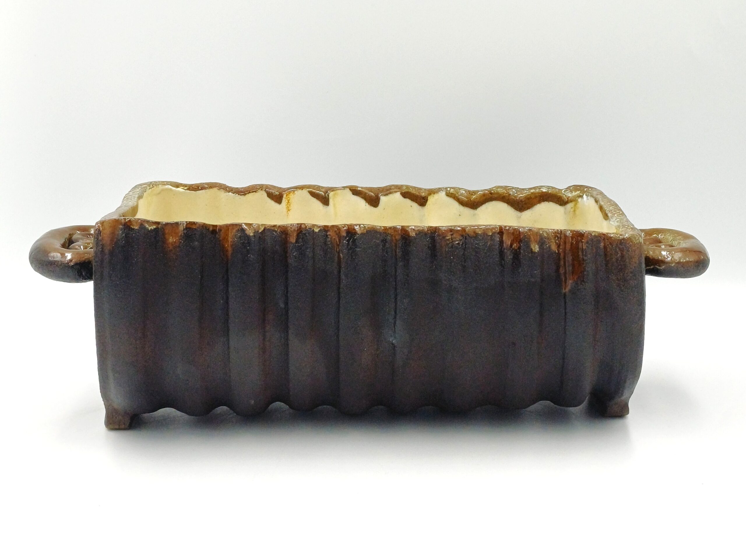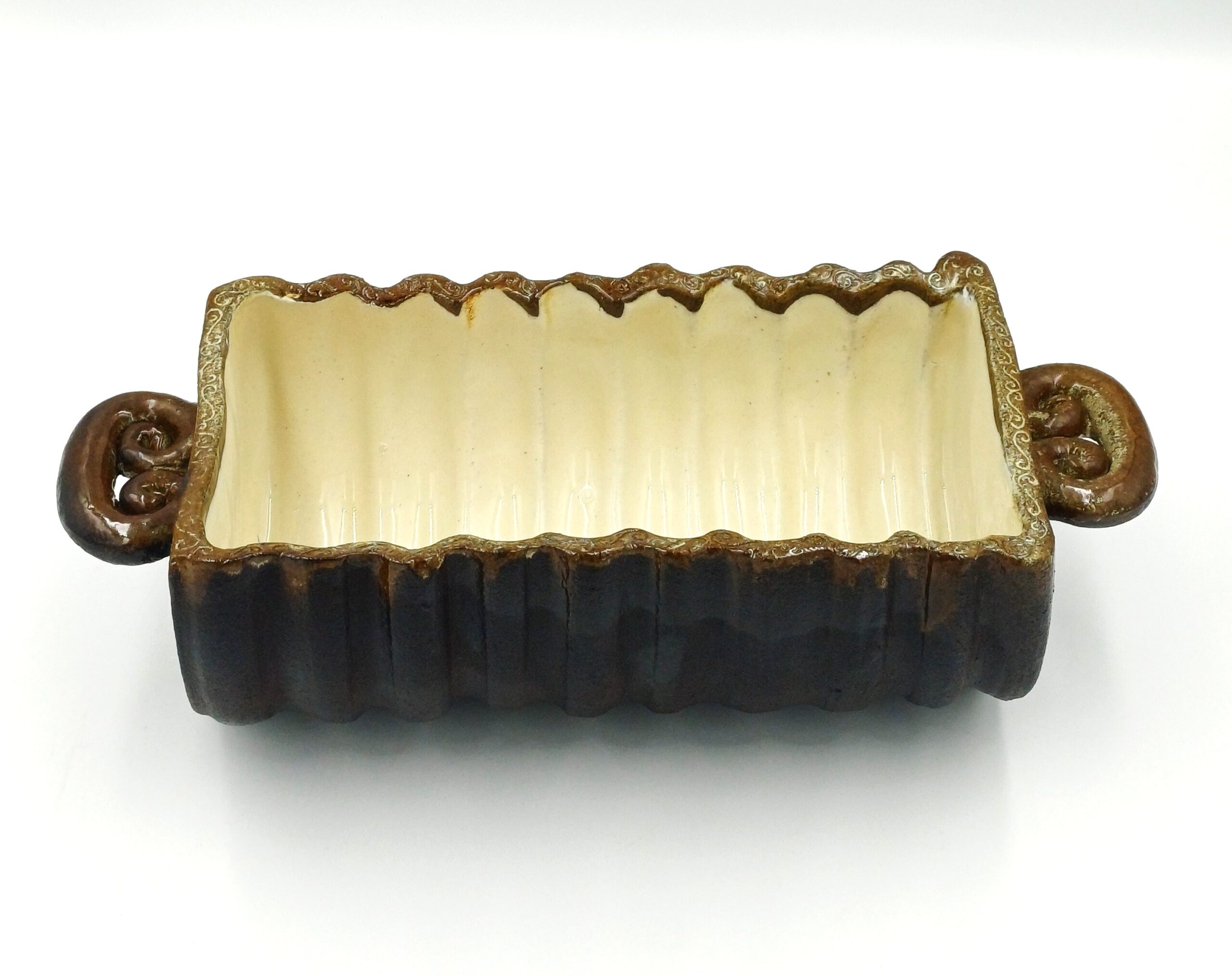 The clay baker with handles is different in the potsticker series. It is designed for baking a traditional Slovenian cake called potica with an elongated shape, which in some places is called sharkelj. It is made of the highest quality clay, which withstands temperature fluctuations well when baked in the oven. The sides of the baking tray are thin so that the cake bakes nicely all over. A flexible glaze makes the inner surface smooth so that the cake rolls out of the pan. The high firing temperature ensures that the baking tray does not absorb grease. For ease of use, the baking tray has a handle on each side. This way, the handmade ceramic cake pan remains of good quality for long-lasting use. The traditional rustic look with a distinctive pattern around the edge, the high quality of workmanship and the material make the clay pot pie pan unique in every respect.