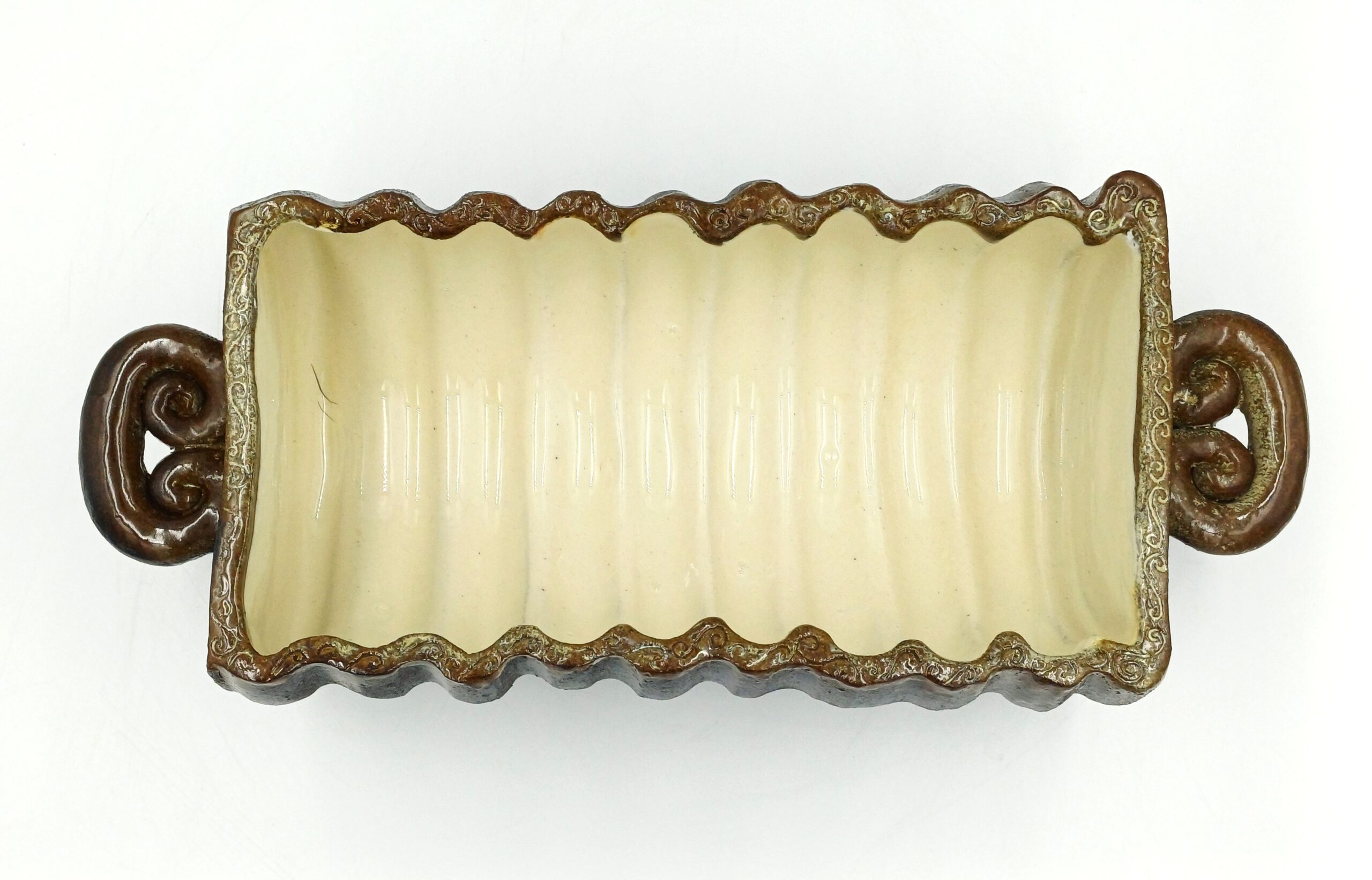 The clay baking dish for potica with handles is a pottery art product designed by Polona Zajc. It is part of a series of clay baking dishes for oven baking. The elongated clay potica dish, as it is also called, is made in the traditional way. It is turned on a potter's wheel and shaped into an elongated form. Handles are added on each side to make it easier to remove from the oven. It is made of red stoneware, and the interior is coated with white clay. It is fired at 1220°C. The surfaces that come into contact with food are glazed with a glaze that is certified for household use (traceability mark LOT17). The baking dish is 30 cm long, 23 cm without handles, 12 cm wide, and 9 cm high.