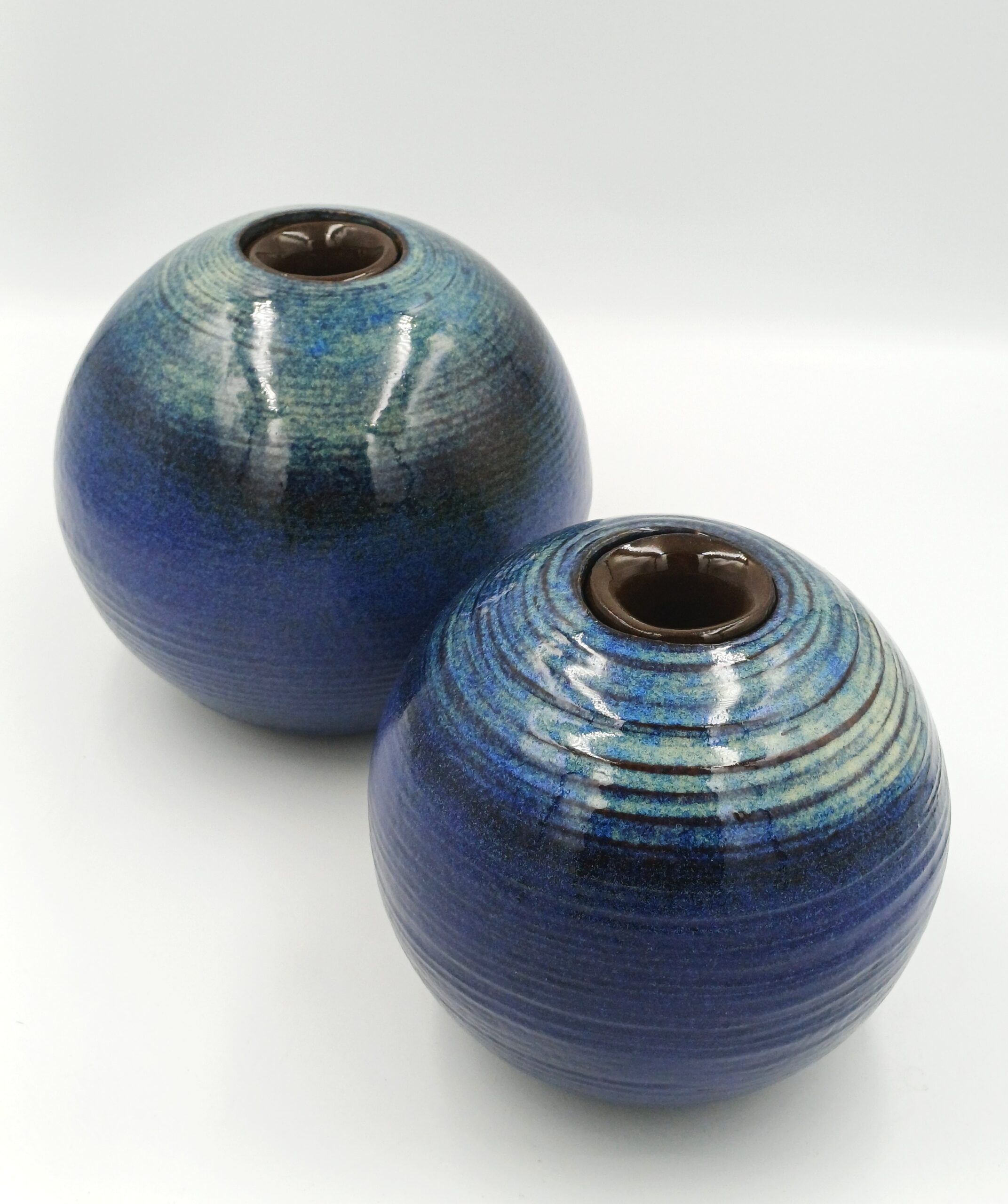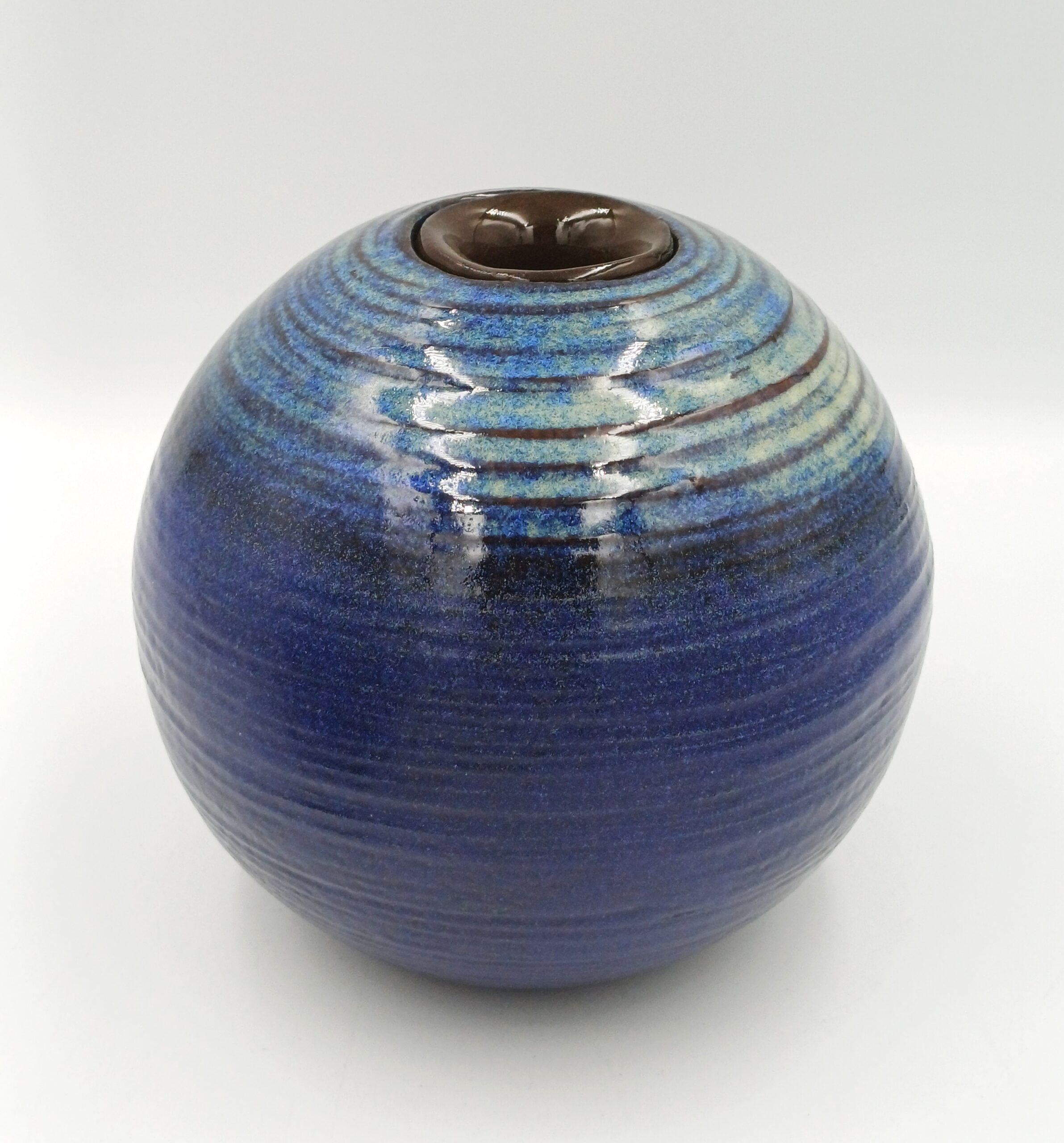 Unikatna okrogla keramična vaza je izdelek pottery art oblikovanje gline Polone Zajc. To je ročno izdelana glinena krogla z vložkom, ki je vstavljen in zadrži vodo. Krogla je narejena iz črne gline, glazirana z modro bleščečo glazuro. Po površini ima vrezane koncentrične kroge, ki jih prelivajoča se glazura dodatno poudarja. Glina je žgana pri temperaturi 1200°C, ko se spremeni v kamenino. To je izredno trden in ne porozen material, ki drži vodo. Krogla oziroma vaza ima premer 14 cm.