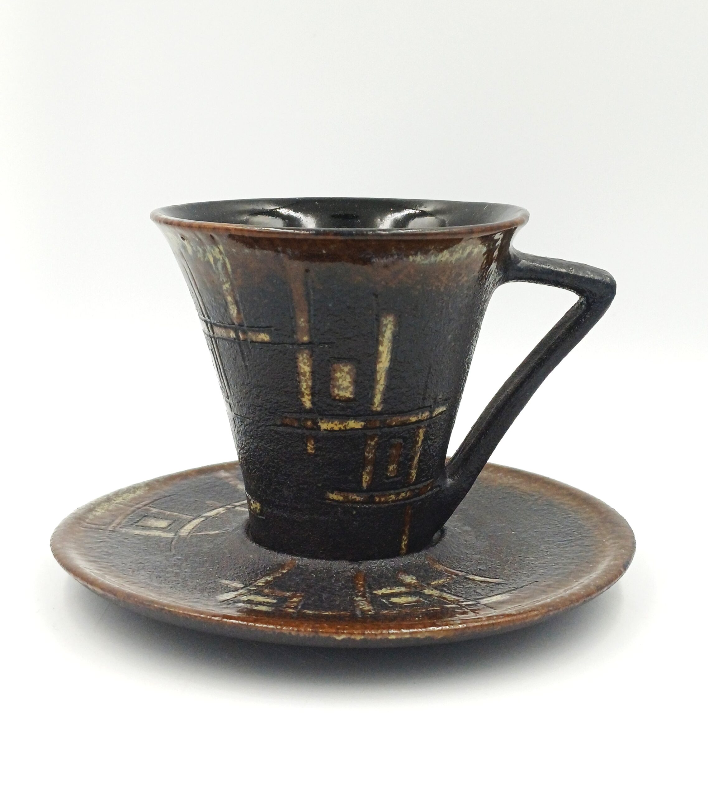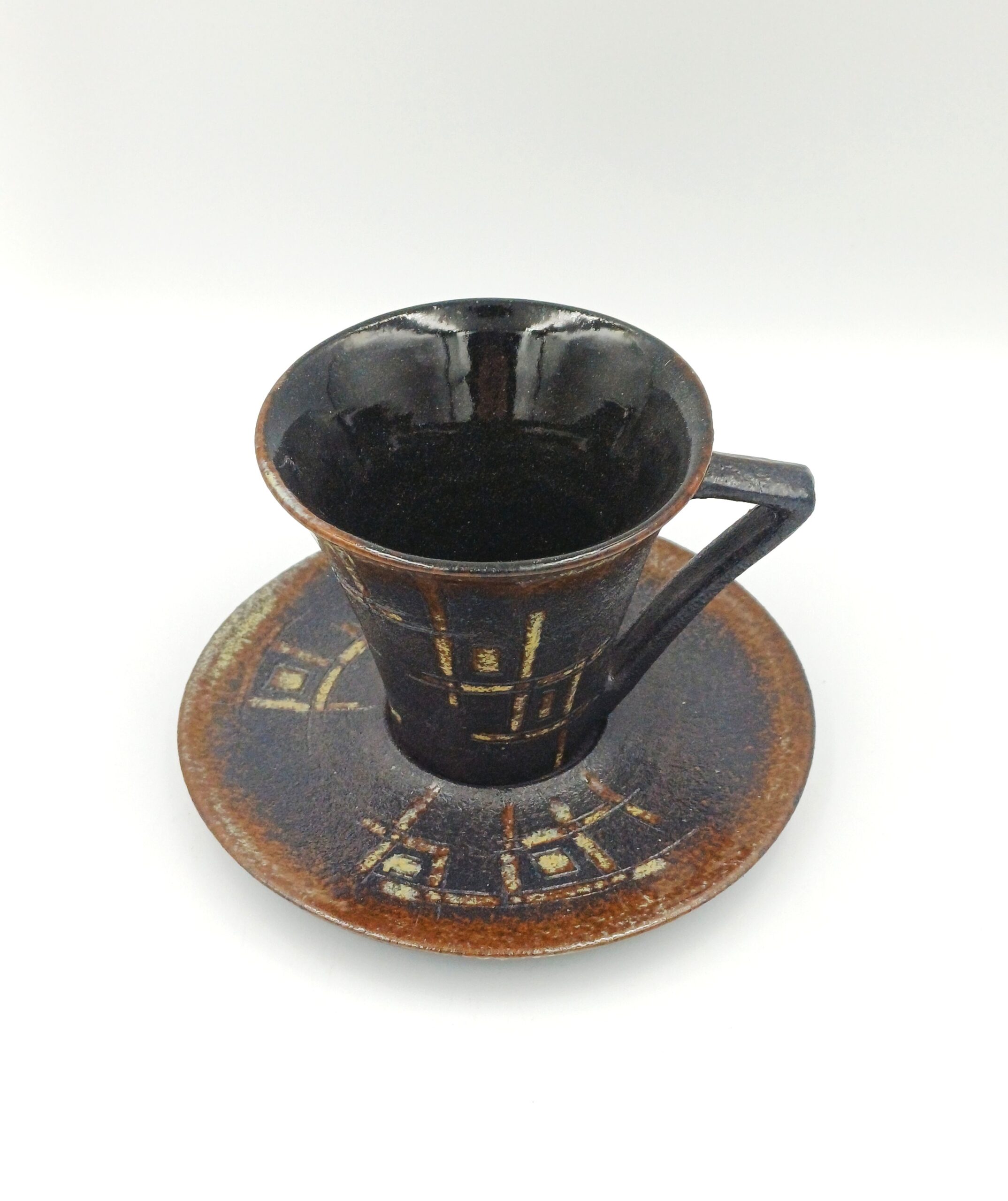 Rjava unikatna skodelica za kavo je izdelek pottery art oblikovanje gline Polone Zajc. To je keramičen komplet skodelice in krožnička, ki sta narejena ročno, na lončarskem vretenu iz črne kamenine. Notranjost skodelice je glazirana z glazuro, primerno stiku z živili (oznaka sledljivosti LOT17). Zunanjost skodelice in krožnička je glazirana z rjavo mat glazuro, detajli so poslikano z prelivajočo se drap glazuro. Žgana je pri temperaturi 1220°C. Skodelica je popolnoma uporabna za razne pijače, po uporabi se lahko opere v pomivalnem stroju. Višina skodelice je 8 cm, premer krožnika je 14 cm.