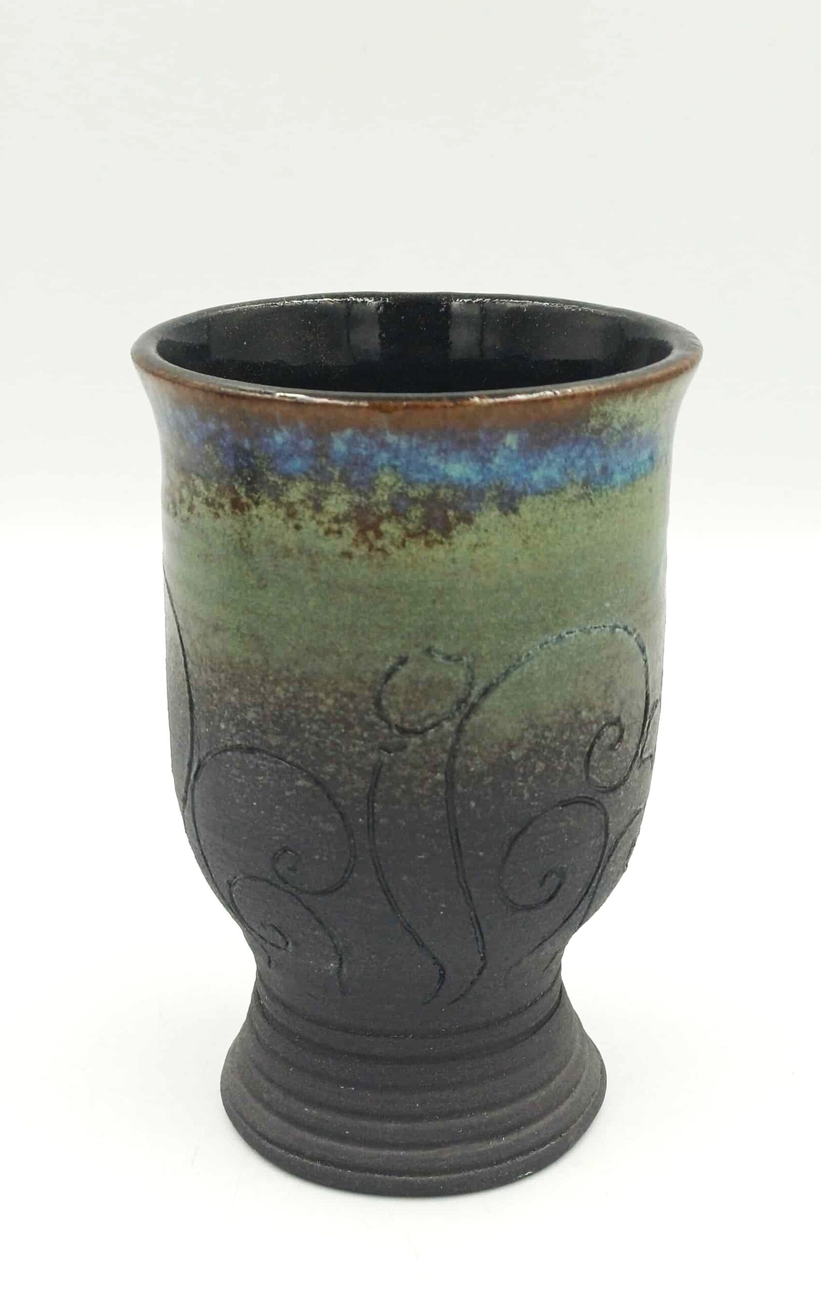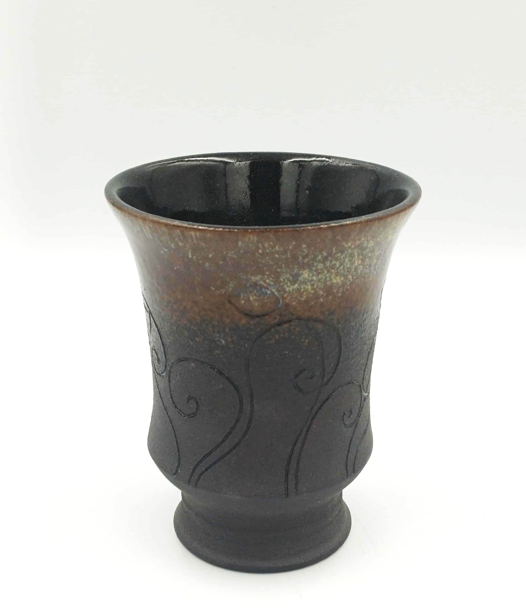 Unikaten glinen kozarec je izdelek pottery art oblikovanje gline Polone Zajc. Zvrten je na lončarskem vretenu iz črne kamenine. Zunanjost je glazirana z mat glazuro, ki se v detajlih preliva v čudovito bleščečo barvo različnih odtenkov. Notranjost je glazirana z glazuro, primerno stiku z živili (oznaka sledljivosti LOT17). Kozarec iz kamenine je žgan pri temperaturi 1220°C. Na sliki in v galeriji je serija glinenih kozarcev različnih oblik in barv. Vaš izbor pošljite na info@potteryart.eu. Volumen kozarcev je 200ml.