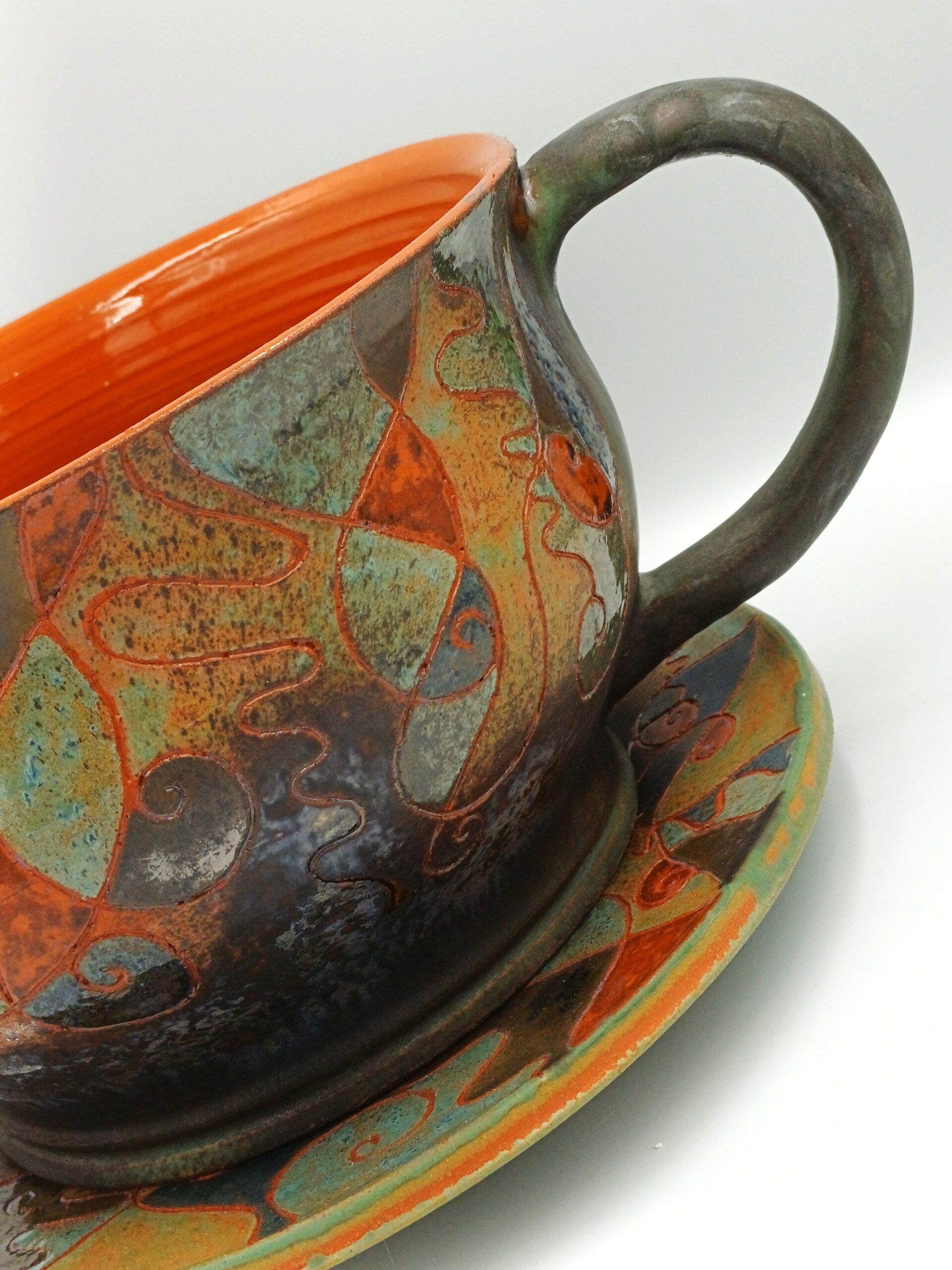 Glinena vrtna skodelica je izdelek pottery art oblikovanje gline Polone Zajc. To je glinena vrtna posoda, oblikovana v skodelico z ročem in krožnikom. Narejena je na lončarskem vretenu iz rdeče gline. Krožnik in skodelica sta ročno poslikana v živahnih odtenkih različnih glazur. Na dnu ima skodelica vrezano luknjico, tako da je primerna kar za direktno sajenje rastlin ali pa vanjo postavite še lonček z zemljo in rastlinami. Žgana sta pri temperaturi 1030°C. Premer skodelice in krožnika je 28 cm.