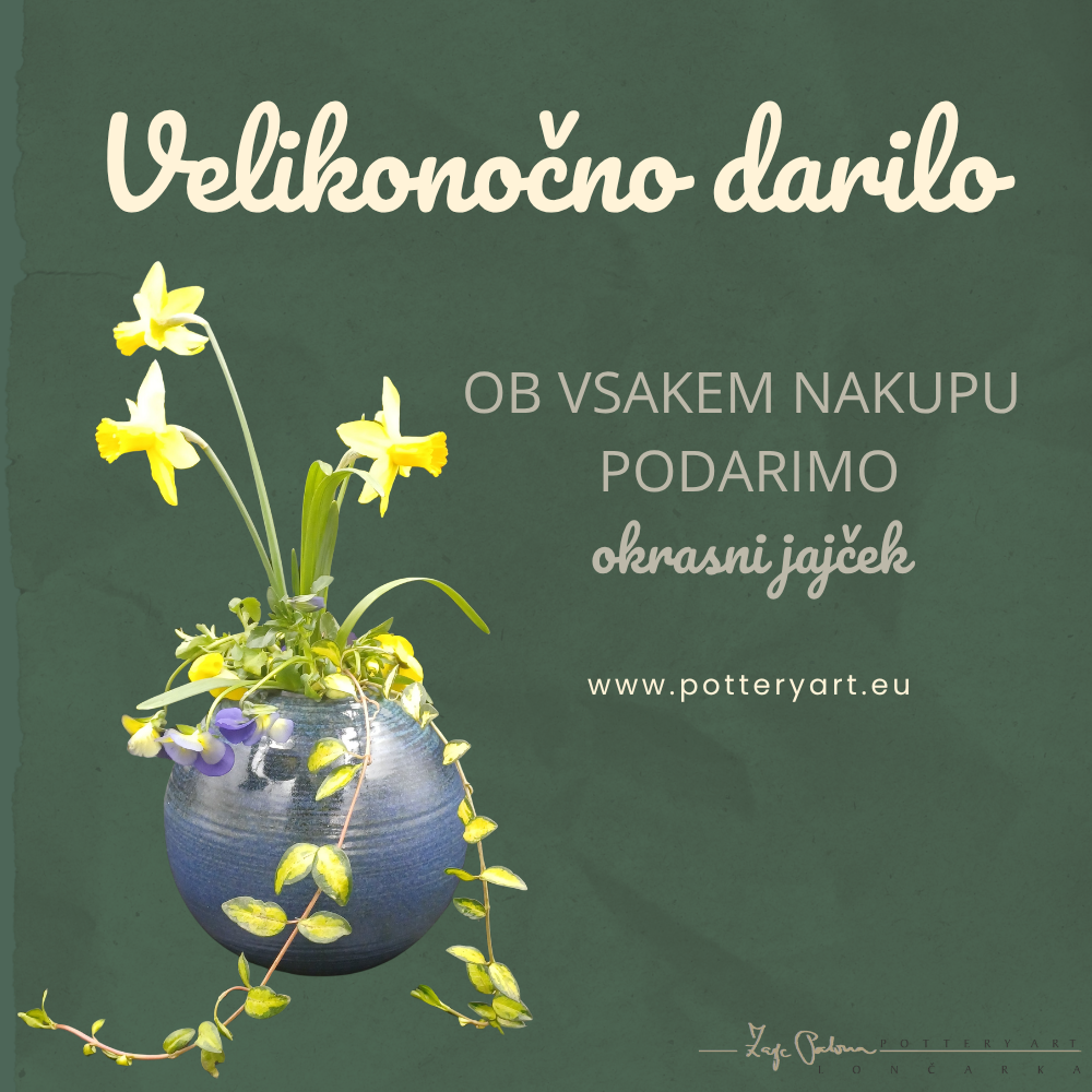 Čeprav za ta pomladni praznik ni značilno obdarovanje smo se v pottery art odločili za akcijo obdarovanje za Veliko noč. Ob vsakem nakupu smo podarili keramičen jajček. Za to priložnost smo oblikovali letake na katerih so naši izdelki. Dodali smo jim pomladno cvetje, ki nas razveseljuje v tem času. Prevladujoča rumena in umirjeno modra z večno zeleno, to je bila prava kombinacija za popestritev izbranih unikatnih izdelkov, ki jih najdete in lahko kupite na naših straneh. Ob tem pa ročno pobarvana pisana jajčka iz gline, ki popestrijo vsak dom ob tem prazničnem času. Pa seveda veliko cvetja, ki skupaj z vedno toplejšim soncem prinaša veselje v naša življenja.