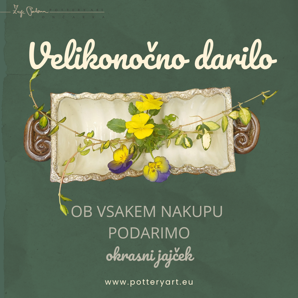 Velikonočno darilo je prodajna akcija pottery art oblikovanje gline Polone Zajc v letošnjem pred velikonočnem času. Ob vsakem nakupu v tem času smo podarili unikatno, ročno izdelano keramično jajce. Na naših spletnih straneh je veliko najrazličnejših keramičnih izdelkov. Prav vsi so izdelani in prav tako poslikani ročno. Večina jih je unikatnih, samo po en kos. Nekateri so sestavljeni v komplete. Nekaj pa jih je narejenih v limitiranih serijah.