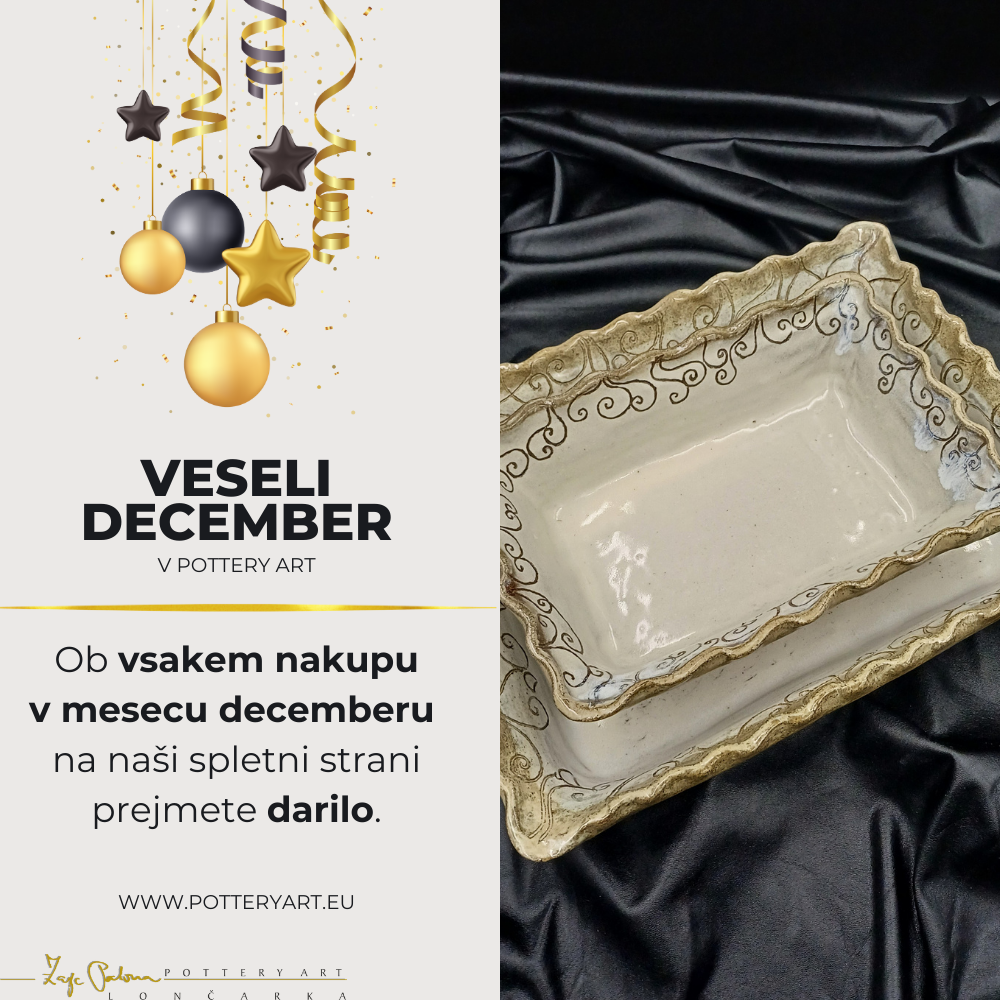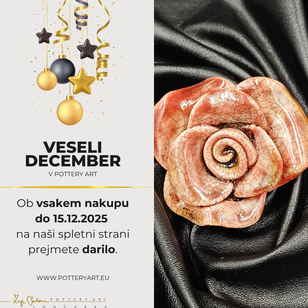 Veseli december 2025 je prodajna akcija na spletni strani potteryart.eu. Poteka vse od začetka decembra in se danes, z zadnjim dnem decembra in tudi z iztekom leta 2025 končuje. Potekala je v dveh delih. Do 15. 12. smo razposlali letake, kjer smo potencialne kupce obveščali o prodajni akciji na naši spletni strani, od tega datuma naprej, pa smo jih konkretno vabili na ogled spletne strani. V obeh akcijah je bil ogled dober in je posledično privabil kar nekaj kupcev. Seveda se vsem lepo zahvaljujemo in vas vabimo, da nas spremljate še naprej.